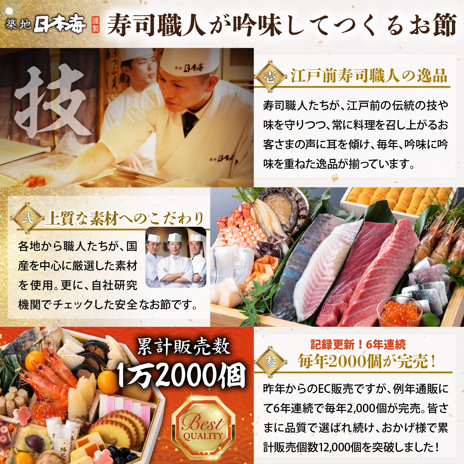 創業80余年の豊洲市場仲卸「米川水産」が目利きをした上質で新鮮な魚介を職人が技と心で握る「築地日本海」。その熟練の職人が、素材の選定から調理法、盛付にいたるまでプロデュースしたおせちです。