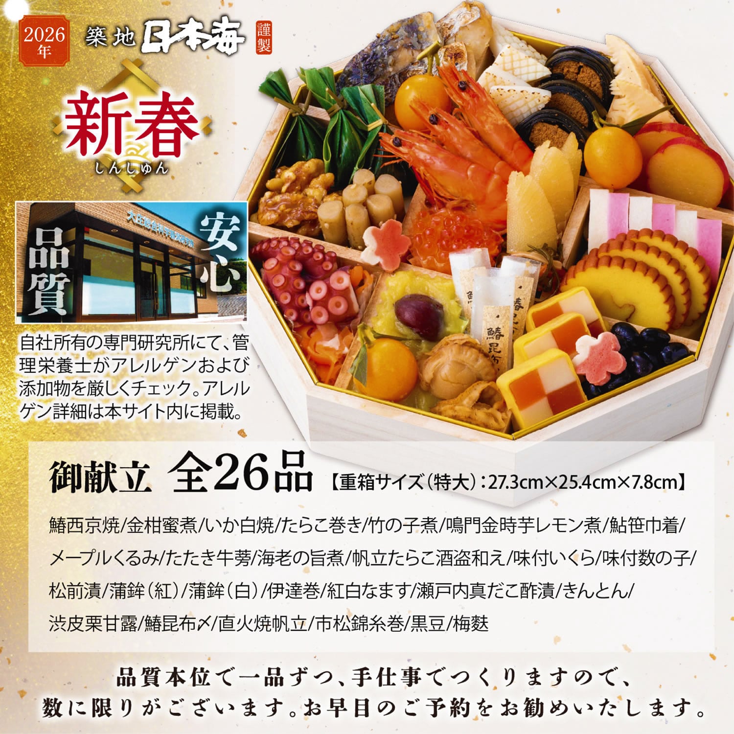 1段重に全26品目を贅沢に詰め合わせますが、品質本位の考えにもとづき、1品ずつ手仕事で作ります。よって数に限りがございます。毎年完売の品でもあり、ぜひ早めのご予約をいただき、華やぎ溢れる新年をお迎えください。